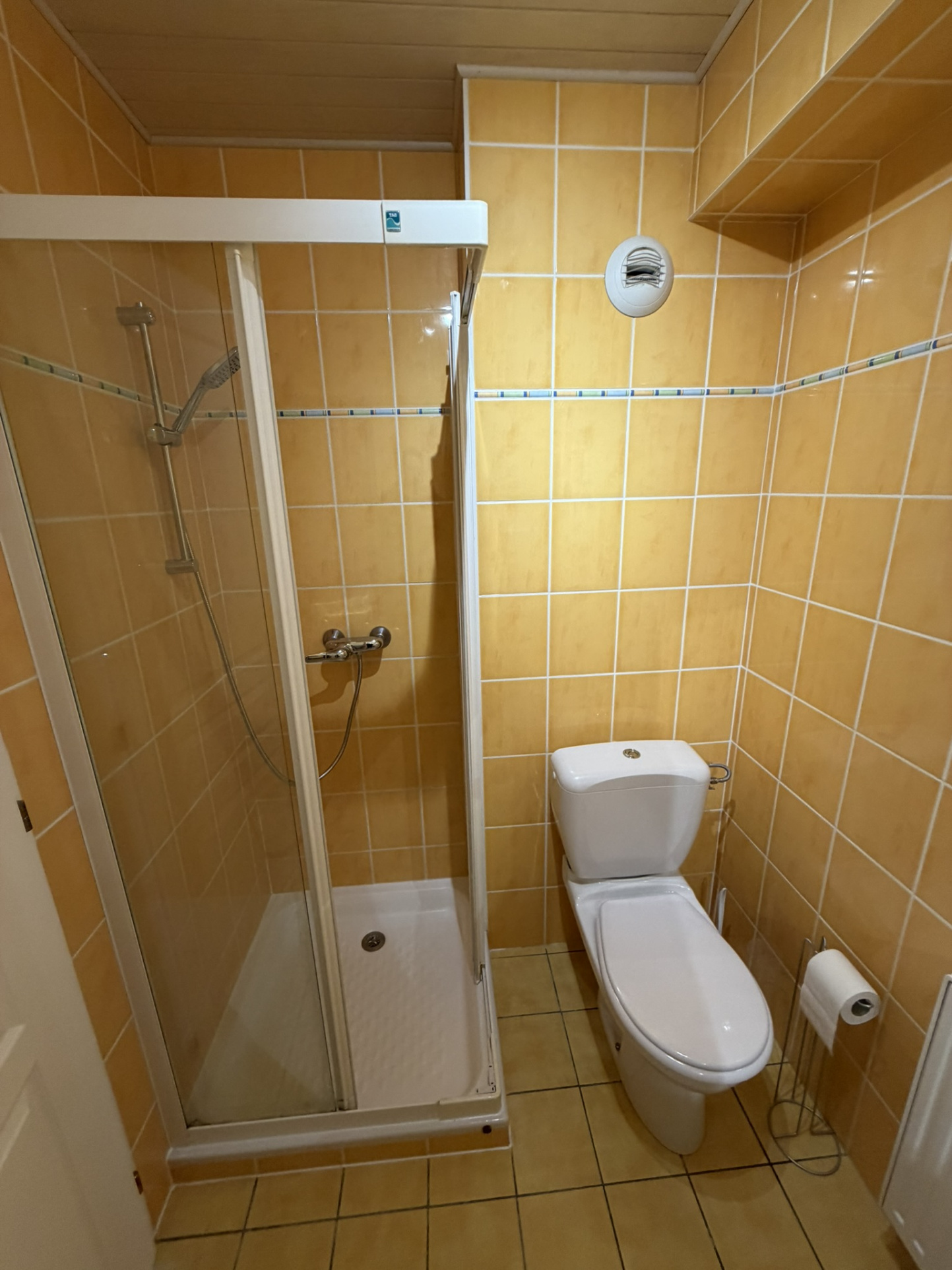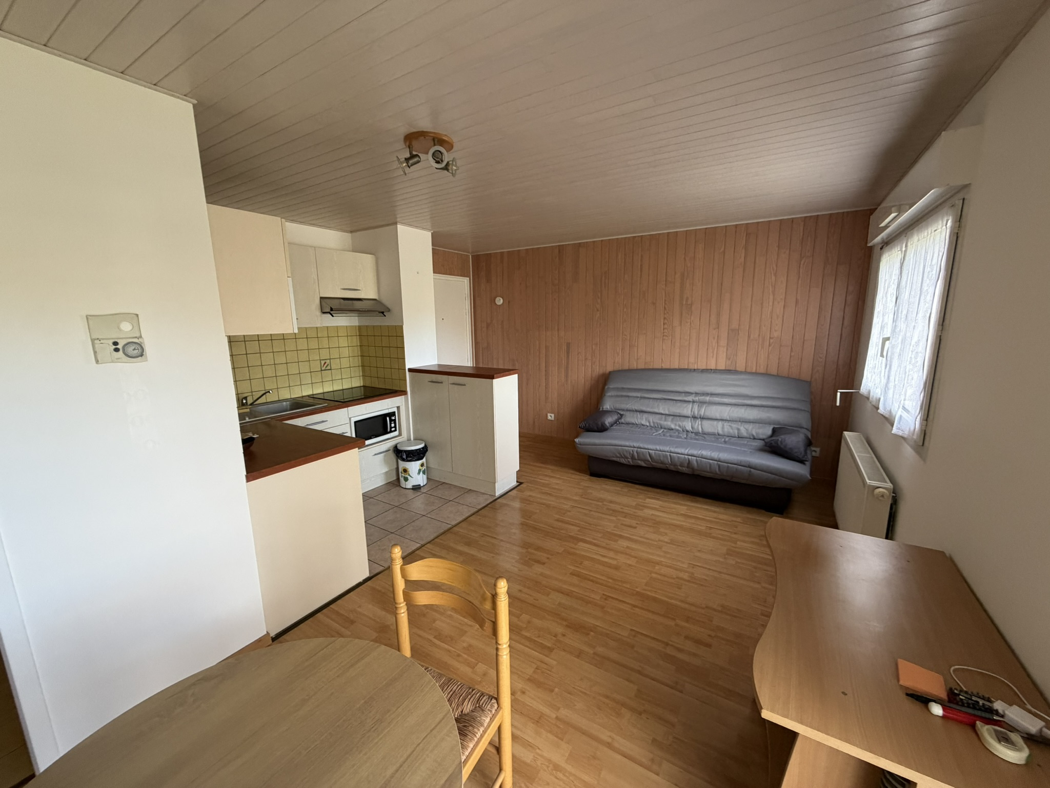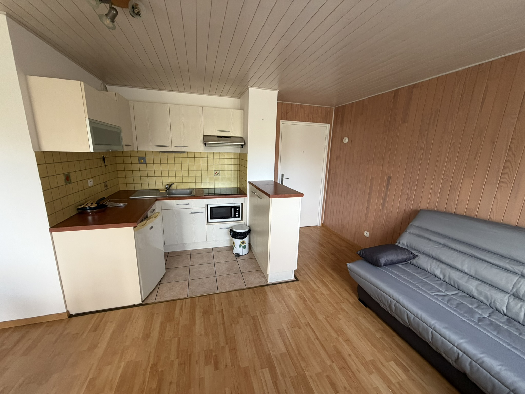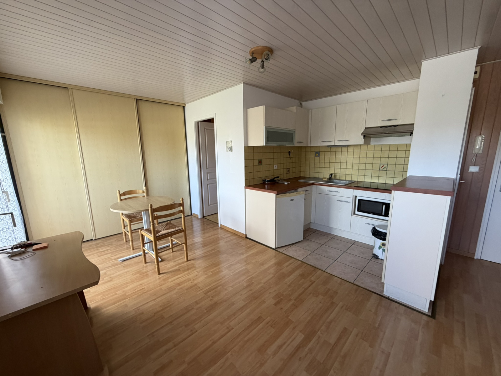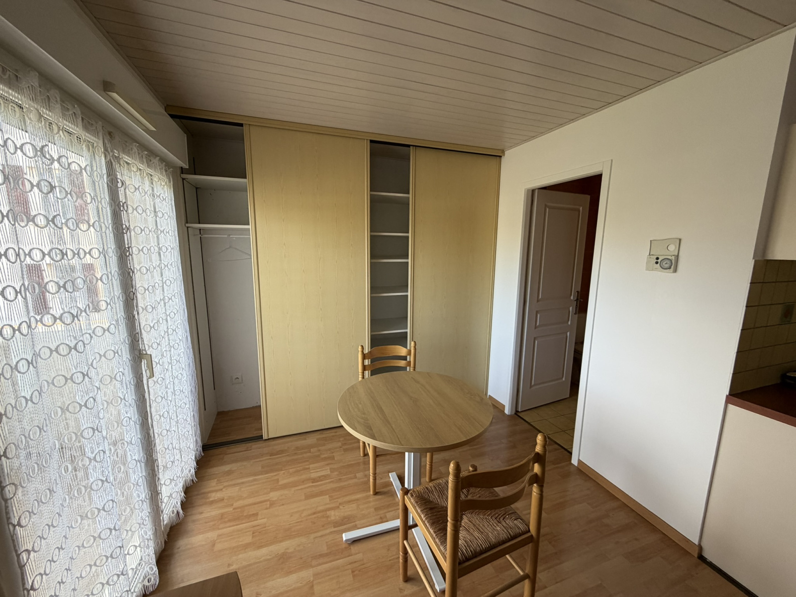Pièce principale avec coin cuisine équipée, grand placard et balcon, une salle d'eau avec Wc.